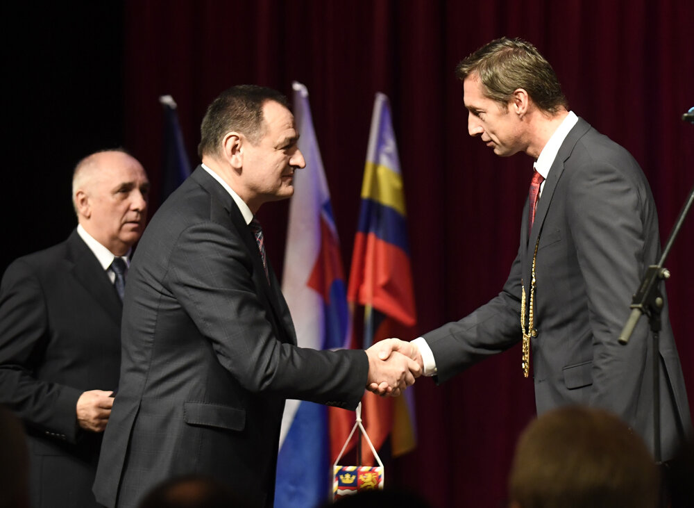 Peter Chudík (vľavo) odovzdal po 16 rokoch úrad. Vpravo nový župan Milan Majerský.