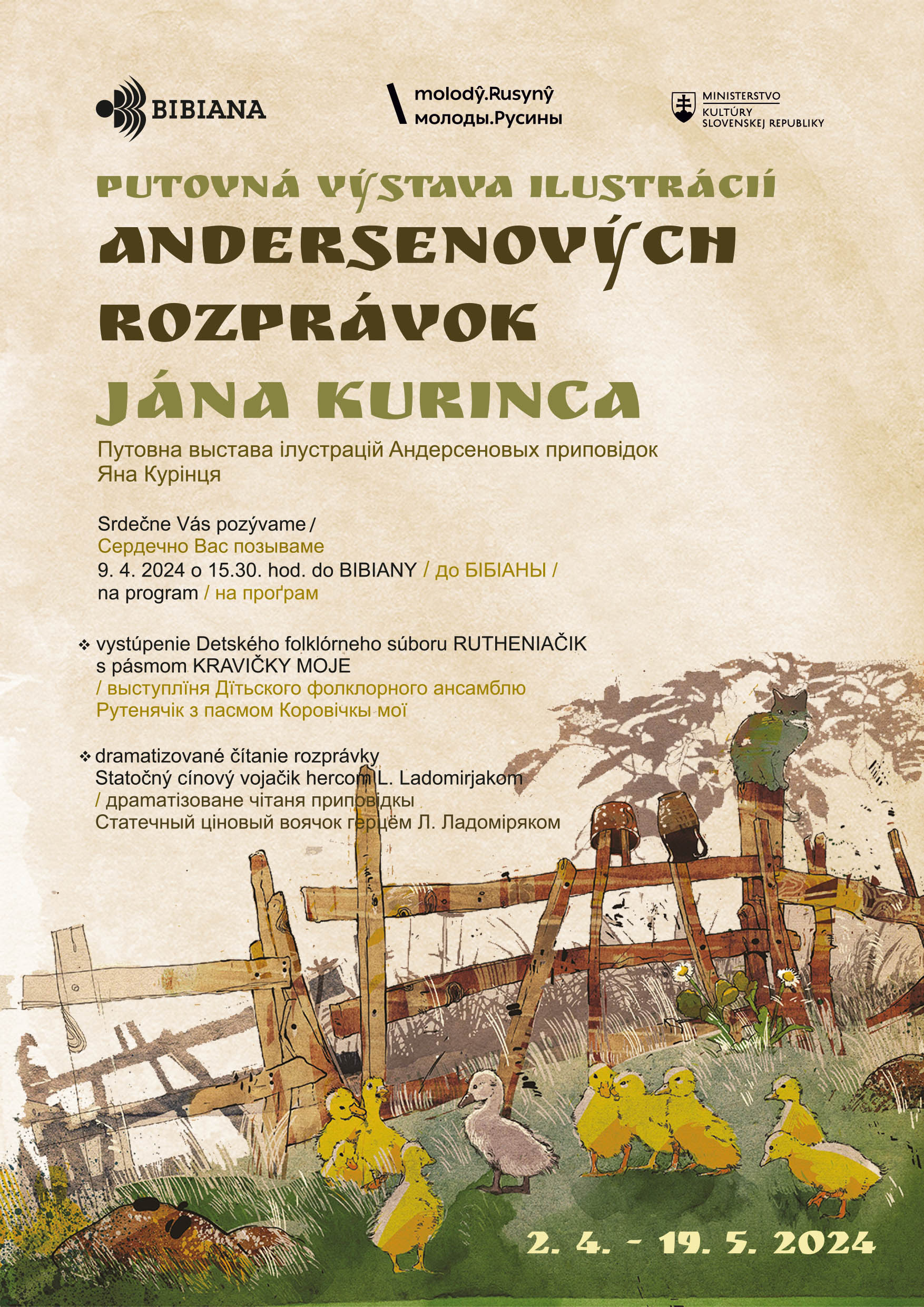 Program k výstave sa bude konať týždeň po Veľkonočnom utorku 9. apríla 2024 o 15.30h, kedy vystúpi detský folklórny súbor Rutheniačik z Bratislavy s pásmom v rusínskom jazyku Korovočkŷ moji (choreografia detských hier, rýmovačiek a piesní pri pasení kráv na lúke z Malého Lipníka z okresu Stará Ľubovňa). Ďalej bude nasledovať čítačka rozprávky H. Ch. Andersena Statočný cínový vojačik rusínskym hercom Ladislavom Ladomirjakom.