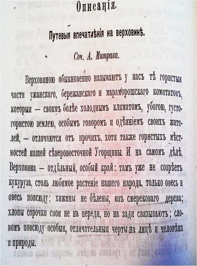 «…Верховина – отдельный, особый край: там уже не созріет кукуруза, столь любимое растеніе нашого народа, только овес и овес повсюду; хижины не белены, из смерековаго дерева; хлопы сорочки свои не на переди, но на заде связывают; словом повсюду особыя, отличательныя черты на лице и человека и природы…