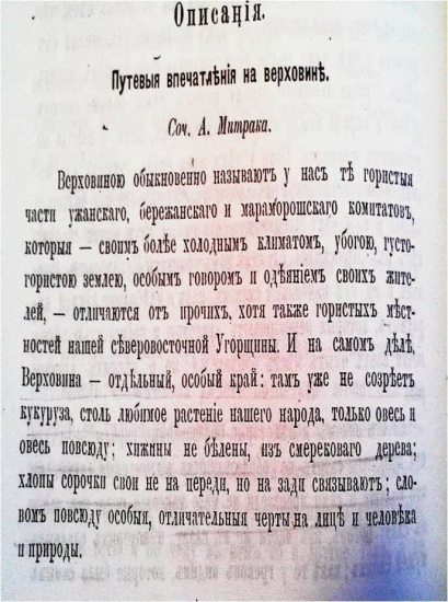 Самая большая біда на Верховині – недостаток путей сообщенія; возового пути тут майже нет, и лишь верхом на маленьких кониках доставляют себі жители к пропитанію нужныя средства.- Один мадьярскій писатель, описуя мараморошскую Верховину, назвал ее Ирландіей Угорщины. – Если под. Ирландіей разуміют бідный, забытый край, скудныя силы коего извлекаются для чужих выгод, но о котором никто не заботится: то Верховіна одна из самих бідніших Ирландій на світі…»