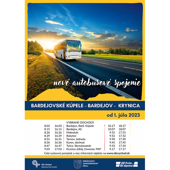 Prešovský samosprávny kraj (PSK) spúšťa od 1. júla 2023 cezhraničné autobusové spojenie z Bardejovských Kúpeľov do poľskej Krynice. Cestujúci ho budú môcť využívať dvakrát denne v každom smere, pričom z Bardejova do centra Krynice sa dostanú za 45 minút. Ide o historicky prvé cezhraničné spojenie v rámci dopravných služieb vo verejnom záujme objednaných a financovaných Prešovským samosprávnym krajom.