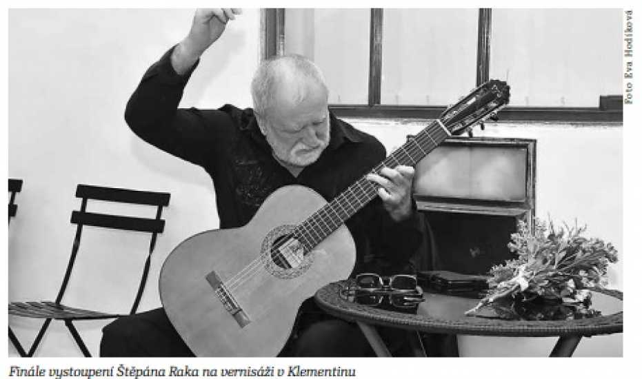 Štěpána Raka na první straně našeho časopisu jsme už před časem měli, ale nynější titulní fotografie je čerstvá. Zachycuje slavného kytarového virtuosa na vernisáži výstavy Spřízněni volbou v listopadu 2018, když právě dohrál své variace na českou, slovenskou a rusínskou hymnu.