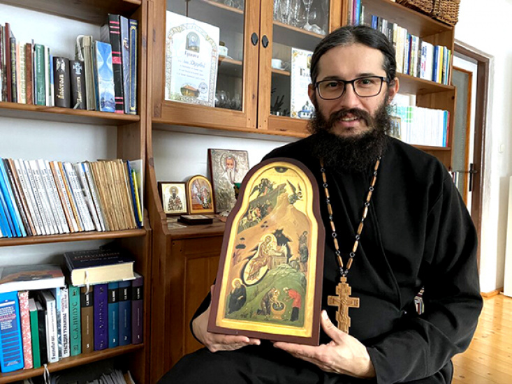 prot. Marián Derco, duchovný správca Pravoslávnej cirkevnej obce v Medveďom v okrese Svidník s ikonou zobrazujúcou narodenie.
