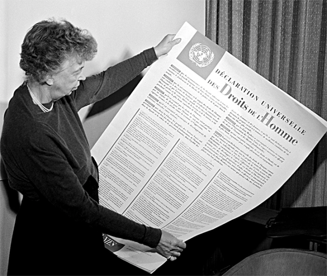 Eleanor Rooseveltová s anglickou verziou Všeobecnej deklarácie ľudských práv v novembri 1949. Deklaráciu vypracoval výbor OSN, ktorému predsedala Eleanor Rooseveltová. Valné zhromaždenie ju prijalo ako rezolúciu č. 217 na svojom treťom zasadnutí 10. decembra 1948 v Palais de Chaillot v Paríži vo Francúzsku.