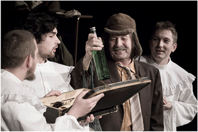 Inscenácia je hereckým koncertom Vasiľa Rusiňáka. Ďalej hrajú: Michal Iľkanin, Vladimír Čema, Michal Kucer a Jozef Pantlikáš. Text sa hrá v preklade Valerija Kupku, vo výtvarnej podobe Doroty Cigánkovej a v réžii Svetozára Sprušanského.