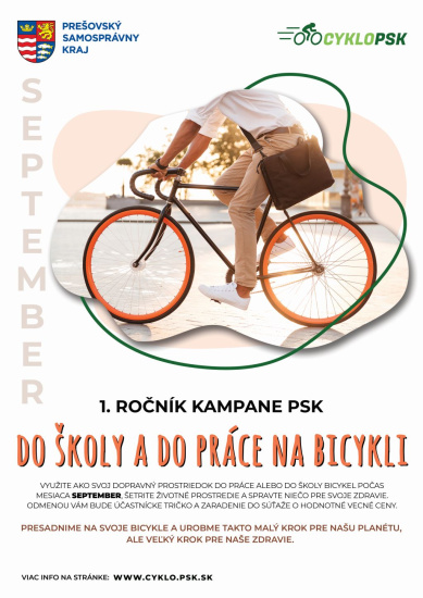 Podporiť rozvoj cyklodopravy v mestách a obciach – to je hlavným cieľom pilotnej kampane Do školy a do práce na bicykli v Prešovskom kraji, ktorú župa spúšťa už od septembra. Zapojiť sa do nej môžu všetci žiaci, študenti, aj pracujúci s trvalým bydliskom v Prešovskom samosprávnom kraji (PSK). Najlepší cyklisti získajú zaujímavé ceny.