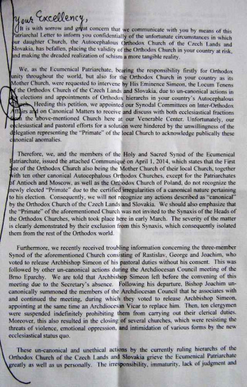 Locum Tenens (metropolitní správce) Pravoslavné církve v českých zemích a na Slovensku Jeho Excelence Simeon se na nás obrátil vzhledem nekanonickým skutkům při volbě a jmenování pravoslavných hierarchů v autokefální Církvi Vaší země jako na Ekumenický Patriarchát, který má odpovědnost v první řadě za jednotu pravoslaví po celém světě a jako Matka Církev také za pravoslavnou Církev ve Vaší zemi, a požádal nás o zásah. Vyslyševše jeho žádost, pověřili jsme výbory našeho Synodu pro mezipravoslavné záležitosti a pro kanonické záležitosti, aby přijaly zde v našem Ctihodném středisku zástupce obou frakcí výše uvedené Církve a vedly s nimi diskuzi. Našemu církevnímu a pastýřskému úsilí o dosažení řešení se bohužel postavila v cestu neochota delegace, která zastupovala "Primase" místní Církve, veřejně uznat tyto kanonické anomálie.