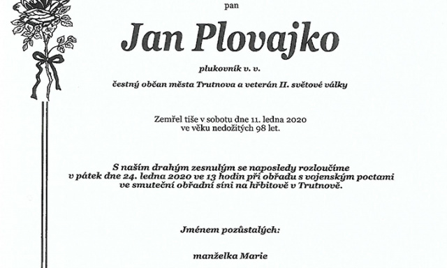 S naším drahým zesnulým se naposledy rozloučíme v pátek dne 24.ledna 2020 ve 13 hodín při obradu s vojenskými poctami ve smuteční obřadní síni na hřbitové v Trutnově.