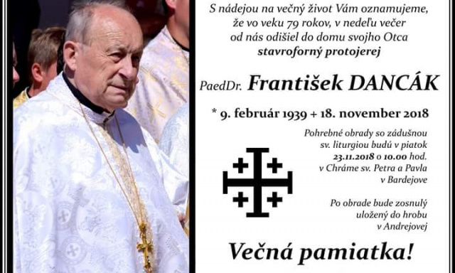V nediľu 18-ho novembra 2018-ho roku, u 79-im roci žŷvota, po dovhij i ťažkij chvoroti dobylo serdce grekokatolyc’koho svjaščenyka, publicistŷ, pysateľa, vŷsokoškoľskoho pedagoga otc’a Františka Dancaka.