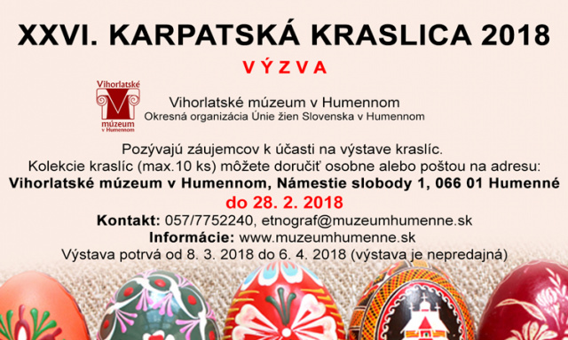 Vihorlatské múzeum v Humennom v spolupráci s Okresnou organizáciou Únie žien Slovenska v Humennom si dovoľujú vyzvať všetkých autorov kraslíc, bez rozdielu veku a použitej techniky zdobenia, k podpore medzinárodnej súťažnej výstavy vo Vihorlatsk…