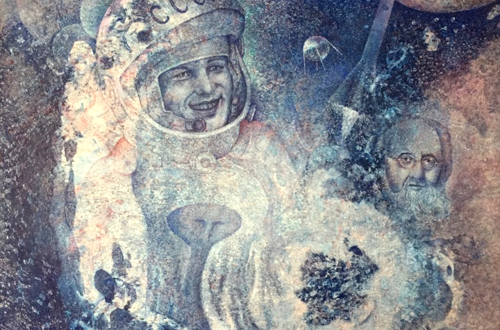 „Obraz som vytvoril na podnet 60. výročia letu prvého človeka do vesmíru. Zobrazil som na ňom Jurija Gagarina a Kostantina Ciolkovského, otca kozmonautiky. Je na ňom aj plno tvári mimozemšťanov,veľa planét a iné atribúty,“ prezradil Andrej Smolák.