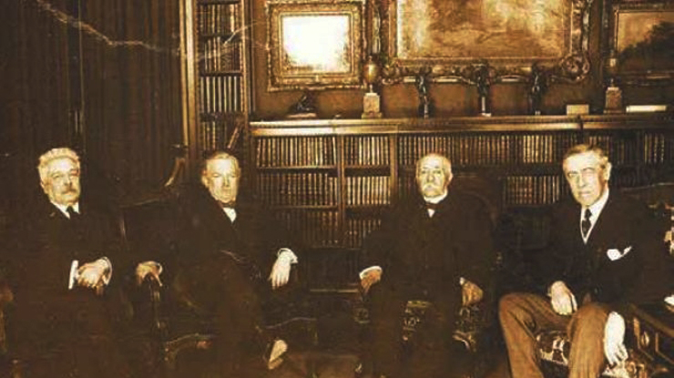 Najvyšší predstavitelia Francúzska, Veľkej Británie, Talianska a USA na mierovej konferencii v Paríži.