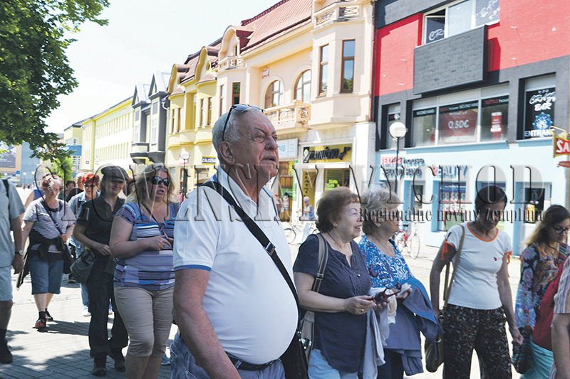 Účastníci sa presunuli do centre mesta, do severnej časti Námestia slobody. „V centre mesta tvorili základ židovské domy, z nich sa po vojne zachovala iba časť. Boli tu obchody a lekárne mnohých Židov, textilné obchody, bolo tu veľa právnikov,“ spomínal Levický. Ukázal na dom, kde stála vychýrená lekáreň pána Fabiána, alebo na dom, kde sa narodil svetoznámy fotograf Jurij Dojč. Samostatnú pozornosť venoval domu, kde v podkroví bývala rodina Blanky Bergerovej, ktorá na konci 2. svetovej vojny zachránila 75 Židov, ktorých chceli nacisti v Starých horách zabiť. „Stala sa martýrkou a zaslúži si uznanie. Dali sme návrh na jej ocenenie Cenu mesta im memorian,“ povedal Levický. Ukázal na budovu súčasnej pošty, kde kedysi stál dom Rózy Lautmanovej, ktorý opísal vo svojej novele Obchod na korze Ladislav Grosman. Pred jeho pamätnou tabuľou Levický uviedol, že manželka pána Grosmana potvrdila, že na Humenné ako svoje rodné mesto spomínal ešte aj na smrteľnej posteli. Levický potvrdil aktivity vedúce k vzniku festivalu zameraného na židovskú filmovú produkciu. Niesol by meno slávneho humenského rodáka, ktoré sa často skloňuje aj s oscarovým ocenením filmového spracovania novely Obchod na korze, kde ako Tóno Brtka herecky zažiaril dnes už nebohý Jozef Kroner. Mičovský prečítal účastníkom pozdravnú esemesku od jeho dcéry herečky Zuzany Kronerovej. Pre pracovné vyťaženie sa nemohla Humenských chodníčkov zúčastniť.