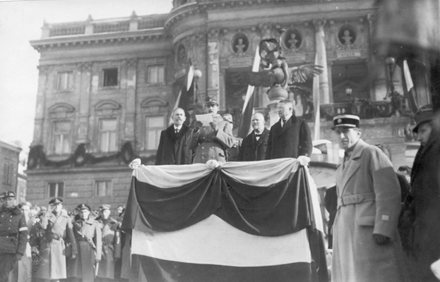 V prosinci 1918 byl Vavro Šrobár pověřen řízením ministerstva a plnou mocí pro Slovensko, které nahradilo prozatímní vládu pro Slovensko. Svůj úřad přestěhoval do Bratislavy 4.února 1919. Na snímku je slavnostní tribuna před bratislavským divadlem při čtení slavnostní přísahy, vlevo ministr František Soukup, vpravo Vavro Šrobár a vlevo od něj ministr František Staněk • zdroj: ČTK