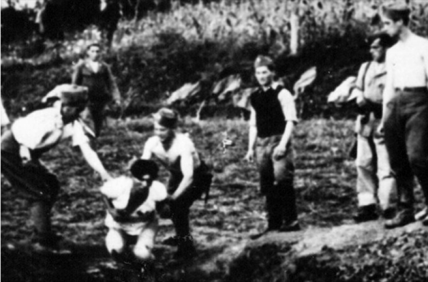 Mladí chlapi v uniformách vyberajú z radu ďalšieho. Vystrašený pán vo veste a košeli je donútený kľaknúť si. Vzpiera sa. Niekoľkí uniformovaní sa postavia za neho, dvaja vedľa neho. Jeden drží zajatca za vlasy, druhý vezme pílku a priloží ju obeti na krk. Urobia si fotografiu na pamiatku a potom chlapíkovi odpília hlavu.