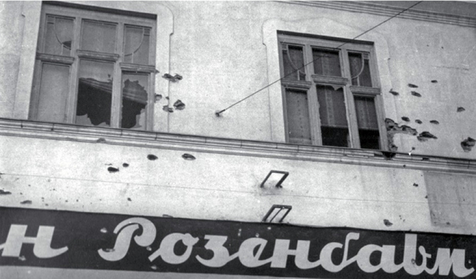 Fasáda domu obchodníka Rosenbauma v Chustu poškozená při bojích ráno 14. března 1939