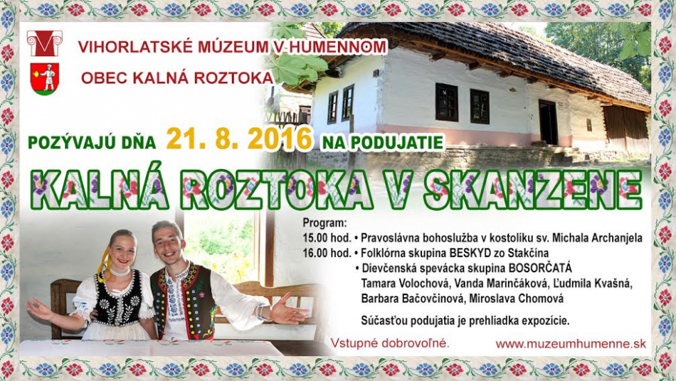 Dňa 21. augusta so začiatkom o 15.00 hodine pozýva Vihorlatské múzeum v Humennom v spolupráci s obcou Kalná Roztoka všetkých rodákov a obyvateľov Kalnej Roztoky, milovníkov folklóru a tradícií, turistov a návštevníkov okolia do areálu Expozície ľudovej architektúry a bývania (skanzenu) Vihorlatského múzea v Humennom na nedeľné podujatie Kalná Roztoka v skanzene.