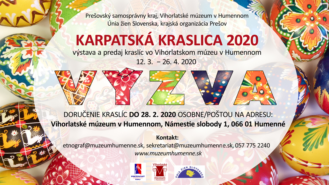 Vihorlatské múzeum v Humennom ako hlavný organizátor medzinárodnej súťažno-prezentačnej výstavy kraslíc Karpatská kraslica 2020 si dovoľuje osloviť verejnosť s výzvou k aktívnej účasti na 28. ročníku medzinárodnej súťažnej výstavy Karpatská kraslica 2020 v termíne 12. marec − 26. apríl 2020. Záujemcovia sa do súťaže môžu zapojiť do termínu 28. február 2020.
