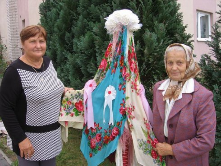 Tradícia káže, aby každý ženích v obci Cernina, okres Svidník, mal svoju vlastnú zástavu, ktorú mu pred svadbou ušije jeho kmotra. Na snímke symbolická zástava, ktorú šila Margita Kvasková (vľavo). Rodáčka z dediny Mária Rompilová (vpravo), ktorá má dnes 85 rokov spomína, že aj pre ňu prišiel jej manžel s takouto zástavou. Foto: TASR" Ján Lašák.