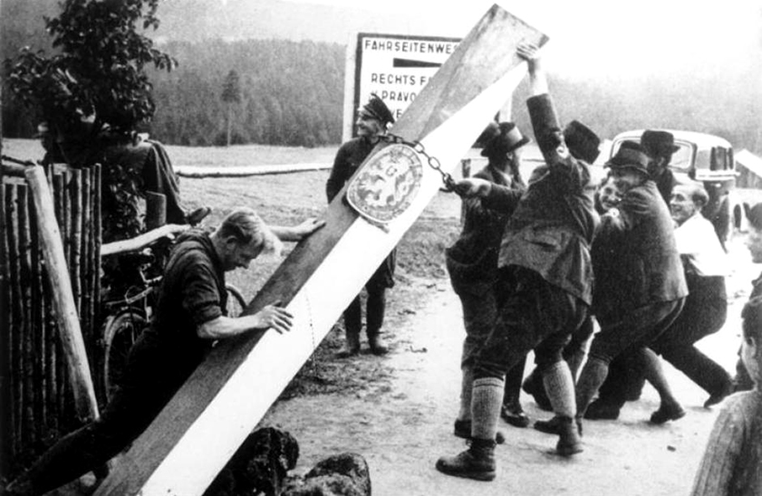 Foto: Sudetští Němci odstraňují československé orientační hraniční sloupy