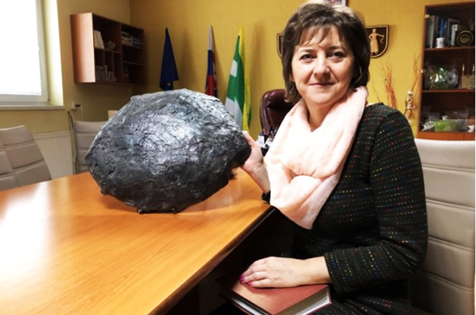 Starostka obce Lenartov Jana Bľandová s maketou meteoritu.