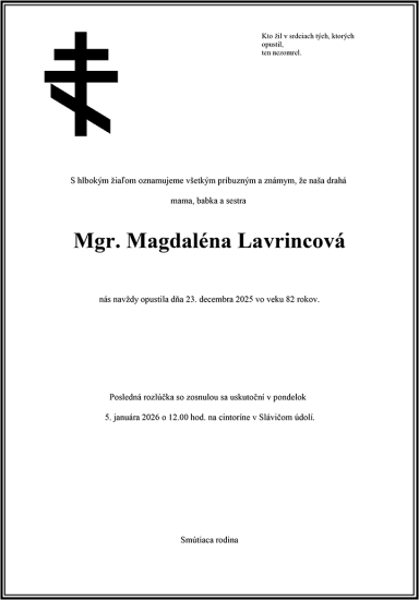 S veľkým zármutkom Vám oznamujeme, že nás navždy opustila Magdaléna Lavrincová, rod. Zozuľáková.