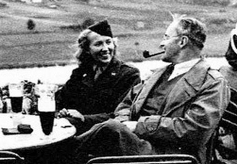 Mária Gulovičová v sedí na lavičke v Prahe v roku 1945 s Allenom Dullesom, neskorším riaditeľom CIA