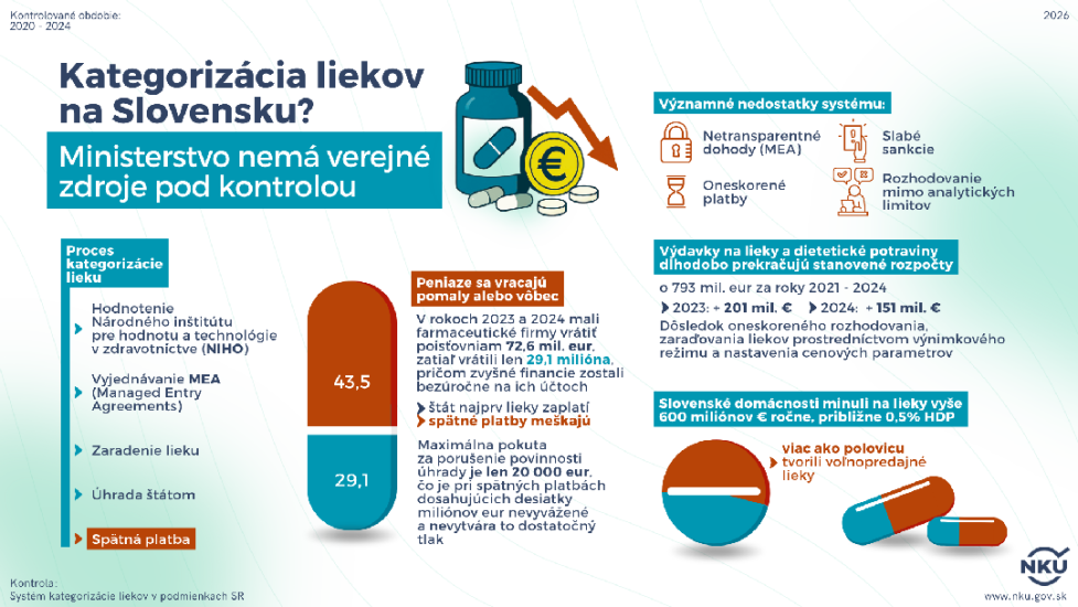 Bratislava 27. marca 2026 – Proces kategorizácie liekov na Slovensku sa v posledných rokoch odklonil od jasných ekonomických pravidiel k individuálnemu rozhodovaniu a zmluvnému vyjednávaniu ekonomických podmienok úhrad. Významne sa tak oslabil mechanizmus, ktorý mal zabezpečovať rovnováhu medzi dostupnosťou liečby a udržateľnosťou verejných výdavkov. Kontrolóri Najvyššieho kontrolného úradu (NKÚ) SR zistili, že približne polovica liekov bola schválená za vyššie ceny, ako to odporučila príslušná odborná inštitúcia (NIHO), čo spôsobilo negatívny finančný dopad odhadovaný vo výške 244 až 356 miliónov eur v horizonte piatich rokov. Na druhej strane tento posun zrýchlil prístup k modernej liečbe a inovatívnym terapiám. Ukázali to závery najnovšej kontroly NKÚ zameranej na systém kategorizácie liekov v rokoch 2020 až 2024. Ministerstvo zdravotníctva SR zároveň nemalo ochranu verejného záujmu plne pod kontrolou z pohľadu konfliktu záujmov osôb v rozhodovacom procese. Pravidlá nevytvárali vyváženú protiváhu medzi záujmami verejného a súkromného farmaceutického sektora. Záznamy z rokovania boli v audio formáte s tichými pasážami a rokovaniami mimo záznamu a rezort zdravotníctva nevystupoval dôsledne z pozície ochrany ekonomických záujmov, čo znížilo transparentnosť aj preskúmateľnosť prijatých rozhodnutí. A aj preto úrad odstúpi protokol z kontroly na ďalšie možné konanie Generálnej prokuratúre SR.