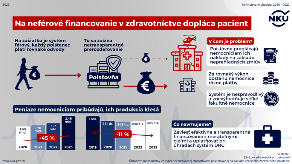 Národná autorita pre oblasť externej kontroly sa problematike zdravotníctva venuje dlhodobo. Po sociálnej oblasti ide na túto verejnú politiku druhý najväčší objem verejných zdrojov. Od roku 2018, keď sa zdravotníctvo stalo prioritou kontrol, uskutočnil úrad 17 kontrolných akcií a ďalšie sú naplánované. Zistenia kontrolórov poukazujú na zásadné problémy v tom, ako sa verejné prostriedky na zdravotníctvo rozdeľujú a využívajú. Kontrola úhradových mechanizmov ukázala, že DRG systém (systém úhrad podľa diagnóz) používame iba čiastočne a jeho reálne zavedenie bez reálnych argumentov dlhodobo odkladáme. Kontrolované nemocnice síce hospitalizačné prípady poisťovniam vykazujú a fakturujú na princípe DRG, ale pri úhradách už poisťovne tento princíp nevyužívajú a postupujú na základe nečitateľných mesačných limitov dohodnutých v individuálnych zmluvách.