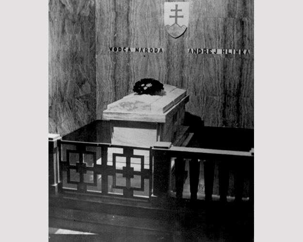 Ak máme Haššíkove slová brať doslovne, Hlinkova rakva mala byť uložená priamo pod Kaplnkou sv. Jána Almužníka, teda v arcibiskupskej hrobke Dómu. Druhou možnosťou je, že sa Haššík vyjadril vágne, medzi priestormi krýpt v Dóme zásadnejšie nerozlišoval a v skutočnosti mal na mysli kanonickú hrobku, čo by zodpovedalo neskoršej dislokácii Hlinkovej rakvy pri Bajzovom hrobe. Interiér mauzólea počas Slovenského štátu. Hlinkove pozostatky boli vložené do uzavretého sarkofágu z čierneho onyxu (Zdroj: Súkromná zbierka