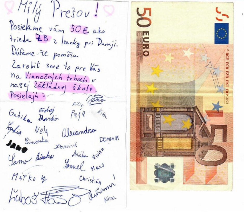 „Milý Prešov! Posielame vám 50 eur ako trieda 7. B z Ivanky pri Dunaji. Dúfame, že pomôžu. Zarobili sme to pre vás na Vianočných trhoch v našej základnej škole," odkazujú v sprievodnom liste k finančnému daru siedmaci.