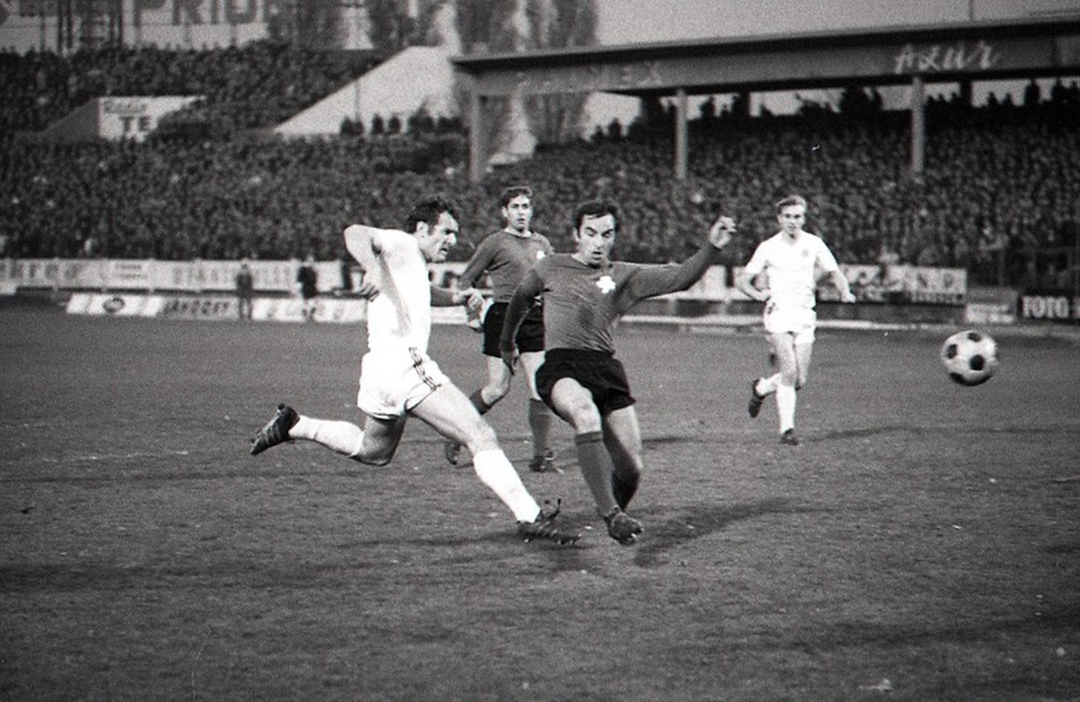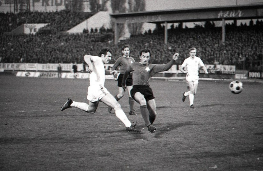 Ján Medviď strieľa gól v zápase Európskeho pohára majstrov Slovan Bratislava - Panathinaikos Atény v roku 1970.