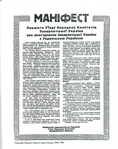 26 ноября 1944 года в гор. Мукачево делегаты Первого съезда Народных Комитетов Закарпатской Украины (историческое название – Подкарпатская Русь) единогласно приняли Манифест «О воссоединении Закарпатской Украины с Советской Украиной» и выходе из состава Чехословакии. Таким образом Закарпатская Украина провозгласила свой суверенитет. Хотя 15 марта 1939 г. Сойм Подкарпатской Руси провозгласил самостоятельность и переименовал ее в Карпатскую Украину, но не заявлял о выходе из состава Чехословацкой республики, как днем раньше это сделала Словакия.