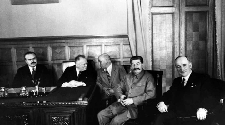 Edvard Beneš (prvý sprava) počas svojej prvej návštevy Moskvy v roku 1935 (ešte ako šéf diplomacie). Po jeho pravej ruke Josif Stalin, prvý zľava Viačeslav Molotov.