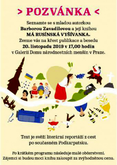 V závěru letošního roku vyjde knižní prvotina Barbory Zavadilové s názvem Má rusínská vyšívanka. Pod vlivem vyprávění své babičky, která pochází z Podkarpatské Rusi a už od poloviny minulého století žije v Čechách, se mladá autorka vydala na tři letní měsíce poznávat zemi, v níž se babička narodila a v níž jsou tedy i její vlastní kořeny. Ze zápisků z cesty vznikl poutavý rukopis ve dvou rovinách: svět z babiččina někdejšího vyprávění autorka konfrontuje s dnešní situací země, která se ještě stále nevymanila z tradic patriarchální společnosti, s jejími sociálními nerovnostmi, se snahou mnoha jejích obyvatel odjet vydělávat peníze do zahraničí i s lhostejností většiny k vlastní společnosti a zemi. Barbořiny zápisky odhalují nejen bolesti života tohoto regionu, ale také krásy jeho přírody a kulturních památek.