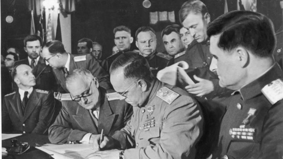 Porazený wehrmacht poslal svojím podpisom do dejín poľný maršal Wilhelm Keitel. Časový posun však spôsobil, že v tom čase už v Moskve bolo po polnoci, a teda 9. mája.