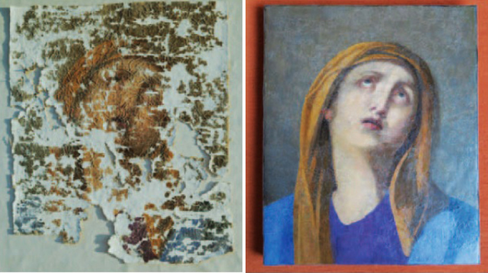 Reštaurátorským prieskumom sa zistilo, že bolo „za päť minút dvanásť". Veľmi slabé a tenké plátno bolo neodborne nalepené na soolite s viditeľnými vlnami a nerovnosťami a na mnohých miestach absentovala maľba. Povrch ostatnej farebnej vrstvy maľby bol skrakelovaný. nbraz našťastie nebol premaľovaný, opravovaný a nebola ani doplňovaná podkladová kriedová vrstva. Paradoxne, týmto neodborným nalepením fragment prežil. Na vzácnom origináli je namaľovaná tvár Madony až veľmi podobná kópii, ktorú urobil pán Vorek. Obraz teda pochádza z kaplnky Sedembolestnej Panny Márie rodiny Rhollovcov v Snine. Svedčí o tom aj historický prieskum pri reštaurovaní.