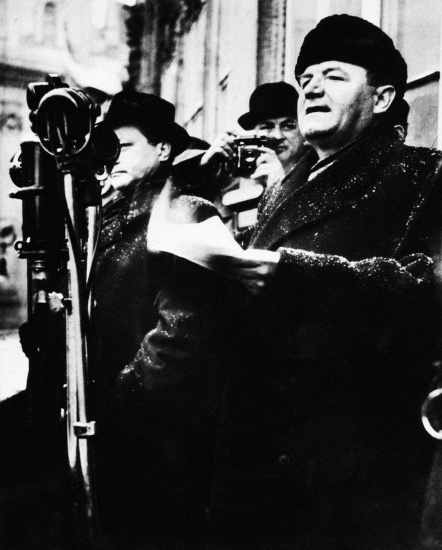 1948 Praha: Premiér Klement Gottwald pri slávnom prejave. Vedľa neho stojí jeho priateľ Vladimír Clementis, ktorého v roku 1952 po vykonštruovanom procese s Gottwaldovým súhlasom popravili a z fotografie vyretušovali. /ČTK/