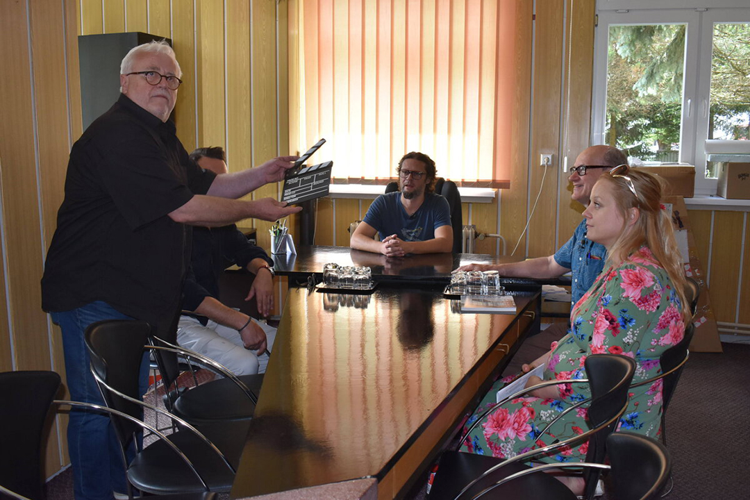 Režisér Ján Ľubomír Slivka (vľavo s klapkou) a scenáristka Petra Babič Slivková pri natáčaní filmu s Jamesom Warholom a riaditeľom Múzea moderného umenia v Medzilaborciach Martinom Cubjakom (v strede).