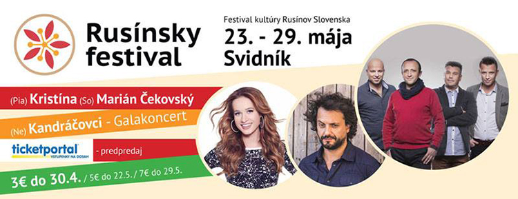 Rusínsky festival s odkazom „od Rusínov pre všetkých“ prinesie multižánrovú prehliadku národnostných menšín s medzinárodným zastúpením. Sprievodné akcie prebehnú počas týždňa a samotný festival vyvrcholí už tradične cez víkend. Kultúra Rusínov bude prezentovaná v podobe divadelných hier, filmových projekcií, besied, vystúpení folklórnych telies, kvalitných hudobných, speváckych a tanečných zoskupení. Ani tento rok nebude chýbať úspešná speváčka Kristína, ktorej koncert sa uskutoční 27.5.2016 (piatok) na amfiteátri.
