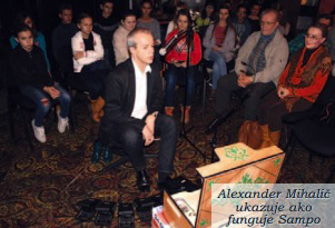 „Keďže pri hraní na hudobný nástroj muzikant bežne používa ústa aj ruky, ja som to doplnil o nohy. Tým sa rozšírili možnosti muzikantov o ďalšie zvuky, ktoré sa len modifikujú z bežnej melódie,“ uviedol Alexander Mihalič. Sampo má názov odvodený z fínskeho eposu a v preklade znamená zázračný mlynček, podľa mytológie by mal prinášať šťastie a bohatstvo. Ovláda sa siedmimi pedálmi, ktoré modifikujú zvuk nástroja, na ktorý hrá pomocou softwéru. Zvuk z nástroja alebo priamo ľudský hlas vchádza do mikrofónu, ktorý ho vovedie do Sampa, ten vyčaruje takú melódiu, akú mu s pedálmi muzikant zadá. Výsledkom je krásna zvuková pasáž obohatená či už o vtáčí spev alebo pásmo niektorej zo známich melódií.