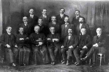 Skupina signatárov martinskej deklarácie. V dolnom rade zľava: K. A. Medvecký, J. Vojtaššák, K. Kmeťko, J. Janoška, S. Zoch, J. Slávik, V. Makovický; v strede: E. Stodola, F. Juriga, ..., I. Dérer, V. Čobrda; v hornom rade: F. Ruppeldt, Š. Krčméry, E. Bežo