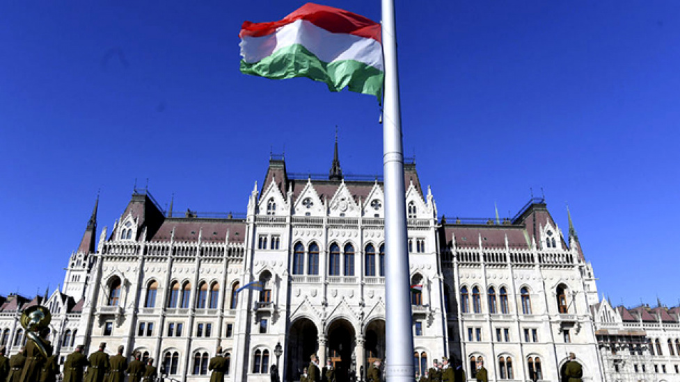 Stožiar so štátnou zástavou pred budovou maďarského parlamentu.