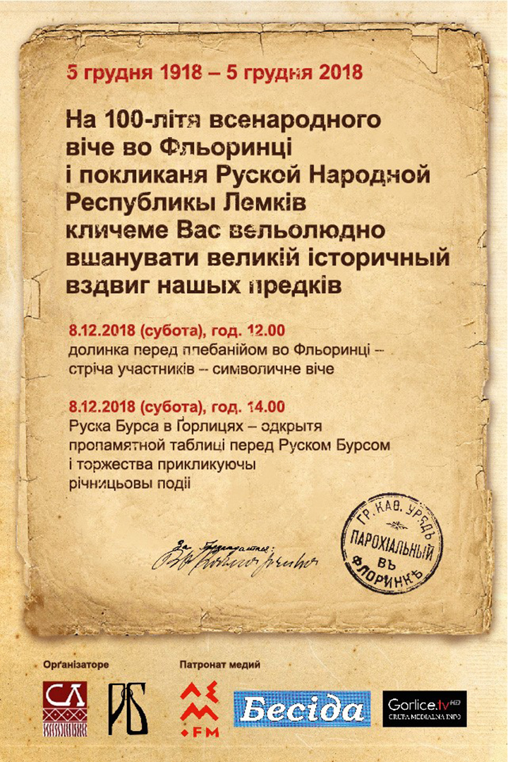 Chočeme prypomunty svitu podii tamtŷch časiv, bo i Lemkŷ – choc nedolho – maly svoju respublyku. Zato prosyme do Fľorynkŷ na misce, de zŷšly s’a v 1918 r. rusyňskŷ delegatŷ, a pak v Ruskij Bursi v Gorlyc’ach budeme prodolžaty totŷ spomynŷ.