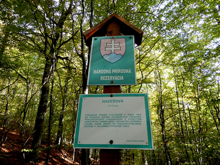 Informačný pútač o Národnej prírodnej rezervácii Havešová.Národná prírodná rezervácia (NPR) Havešová.