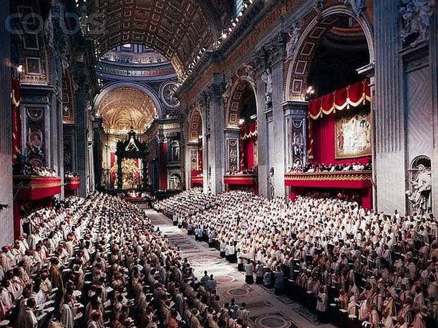 Pohľad do preplnenej svätopeterskej baziliky v priebehu koncilu.