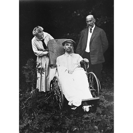 Jedna z posledných fotografií Lenina. Podmoskovskije Gorki po 15. máji 1923. Vedľa neho sú jeho sestra A. I. Jelizarjova-Uľjanovová a jeden z jeho lekárov A. M. Koževnikov. V poslednom roku života bol V. I. Lenin už iba živou mŕtvolou a mnohé veci vrátane nástupníctva v boľševickej strane už nemal pod kontrolou. O revolučné dedičstvo sa uchádzali ctižiadostiví kandidáti vrátane Josifa Stalina. zdroj: https://ru.wikipedia.org/