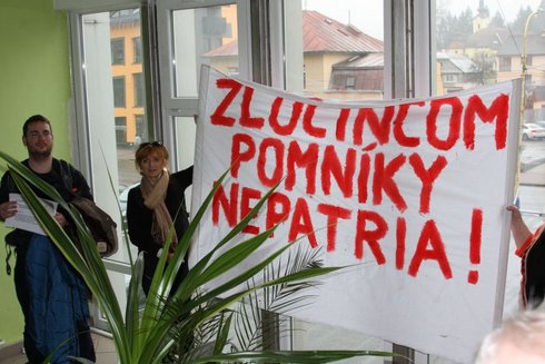 Nad hlavami bolo vidieť transparenty „Zločincom pomníky nepatria“, Biľakove čiernobiele fotografie preškrtnuté červenou farbou ale aj citácie slovenských zákonov o zákaze propagácie zločineckých režimov.
