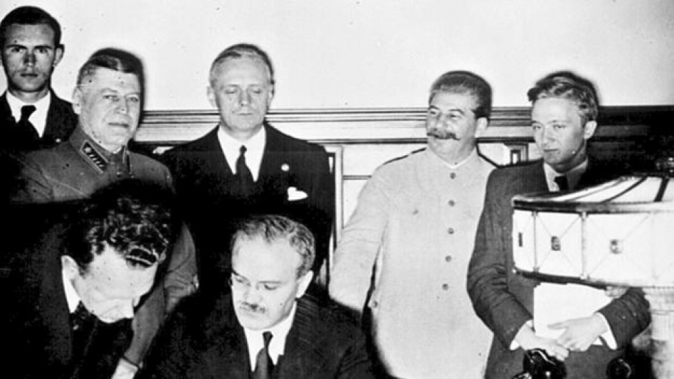 Molotov podepisuje německo-sovětskou smlouvu o neútočení. Za ním je vidět Ribbentrop (v černém) a Stalin (ve světlém, druhý zprava) | Foto: National Archives and Records Administration | Zdroj: Wikimedia Commons