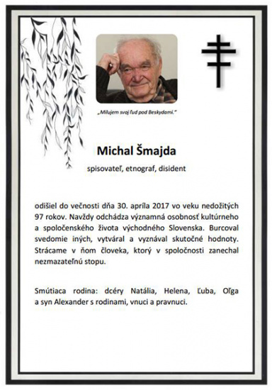 02.11.1920 narodil sa v Krásnom Brode, okr. Medzilaborce, Michal Šmajda, spisovateľ, folklorista, kultúrno-osvetový dejateľ. Pracoval v múzeu v Krásnom Brode a vo Svidníku (1960-1971), zbieral národno-poetickú tvorbu Rusínov, napísal povesť Parazity (1953), zborník poviedok "Vjazka kľučiv" (1956), romány "Tryščať kryhy" (1957), "Korčmarskyj sluha" (1964), "Rozjizdy" (1970). Po r. 1968 bol prenasledovaný, stratil prácu, vylúčili ho zo zväzu spisovateľov. Je držiteľom viacerých domácich a medzinárodných ocenení za literárnu a publikačnú činnosť. V r. 2008 mu prezident republiky udelil Pribinov kríž III. tr. za významné zásluhy o kultúrny rozvoj Slovenska. Zomrel 30.aprila 2017 v Bratislave.